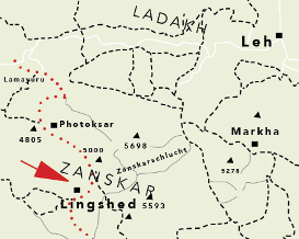 Lingshed ist ein Dorf in Ladakh im nordindischen Himalaya, mehrere Tage Fußmarsch von der nächstgelegenen Straße entfernt und nur über 5000 m hohe Pässe zu erreichen.Das Gebiet ist eine Hochgebirgswüste.